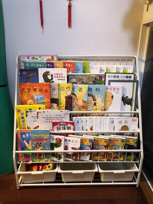 选了好几种,最后还是买了这款。回来组装也很快,有图纸,也有视频,安装也很简单,一步一步跟着做就可以了。整个书架很稳固,不晃,安全性好。宝宝的绘本架真心不能太高,容易倒,很危险。这款尺寸很合适,还是能装不少。最近常看的书放书架,不爱看的就可以暂时放柜子。书架的书可以随时更新书单。宝宝也很喜欢。