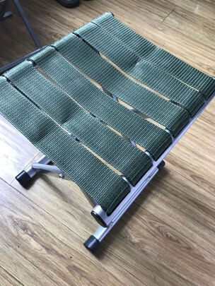 凳子很轻,应该是铝合金的。颜色也不错,比较低调。不足之处:用了不久,马扎面的带子就有些不平整了,要知道坐马扎的人体重才65kg啊。