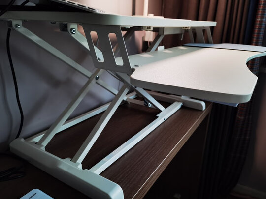 外观样式:白色款,很经典,放在桌上还是蛮搭;产品质量:气动的伸缩神器,不用电源,不费劲,材质还不错,选的白色款式,扎实的质量;使用感受:放在家里桌子上刚好,手摆在键盘上有支撑点,舒适感不错,站立办公高度可调节,颈椎舒服多了