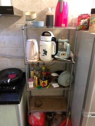 外观样式:买的银色的,收货后组装起来跟图片一样,很好看。每一层都有一个塑料垫子,自己又剪了纸箱子当垫子放上面,脏了可以直接扔,不想洗。放了东西后的外观就看自己怎么收拾了。我就简单放一下,过年期间搬家,东西多乱,没来的及好好摆放。先用着,给厨房腾出空间来。;商品质量:很扎实,用着放心。;配送服务:初五买的,初六送到。京东过年的物流很给力。;承重能力:每一层层高很高,够用。下面放重的、上面放轻的。货架能承受厨房的这些散碎东西。