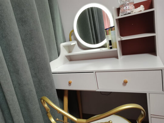 第一次在网上买家具,这个梳妆台是我要的不是很大的那种,这个化妆镜是可以调光度的,有三个调,柜柜也很扎实,就是拿回来的时间有点难拼,嘿嘿嘿,而且那个椅子也很漂亮,八错八错