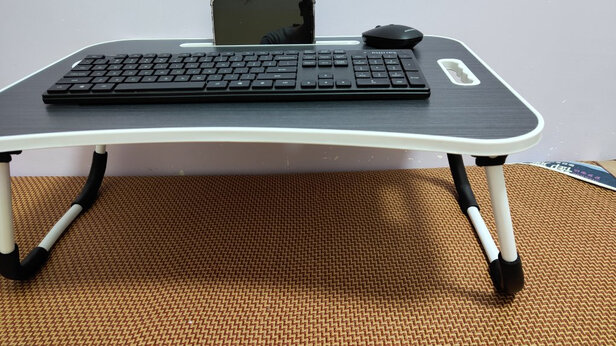 这小桌子很不错,轻巧舒适,高度和大小也适中,放再床上刚好,前面的长型凹槽可以放手机也可以放平板。左边还有放水杯的凹槽,很人性化!值得购买