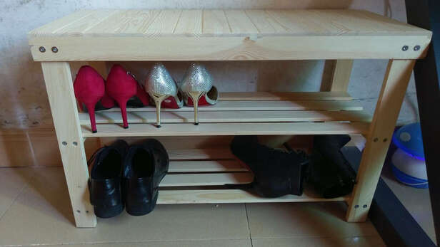 宝贝收到,京东快递送货非常快。东西已安装完成。大概用半小时左右。操作简单用料非常厚实。木板质感也很好,没有异味。纹理也很漂亮。钢管材质也非常好。放鞋的地方也很不错,宽度大小刚好。坐着换鞋很舒服性价比很高,好评。