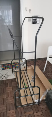 衣架是春节前下单的,由于过年快递停运,年后才收到,安装很方便,感觉还比较结实,由于我放衣架的地方有限,这个尺度大小刚好,唯一不足的就是挂钩上面的那个圆陀有两个没粘牢,刚安好就脱落了,不过还好,自己用502胶水把它粘上了,希望商家在做工质量这方面还应该再加强些!