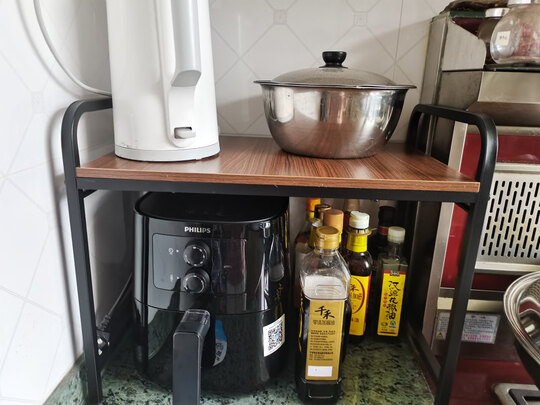 买了空气炸锅回来没地方放 ,就在网上找可以节省空间的置物架,最后选择了蔓斯菲尔厨房置物架,是二层的支架收纳储物架,他的尺寸和我家厨房台面剩余空间十分吻合,拿回来就根据图纸安装好了,安装也简单,一放上去就很完美。