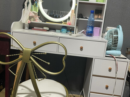 外观非常漂亮的一款梳妆台,做工精细,尺寸大小合适,材质环保,没有异味。非常满意。