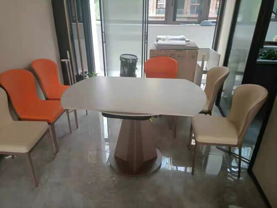 餐桌简约大气上档次,岩板材质桌面,耐磨防刮易清理,质量好,整体搭配很高级。