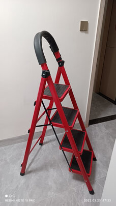 家用梯子收到了,打开包装看了下真如商家描述一样,外型美观,质量好,爬上去站在上面稳稳的,一点也不晃,紫色的稳固件颜色很美,好喜欢