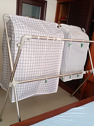 外形外观:是叉字形的衣架,适合在阳台或天台上晾晒被子使用。;承重能力:目前晾衣服晾被子都够用了。;安装服务:自行组装,还是很方便的,不会麻烦;其他特色:配送服务快,第二天就到了,好评