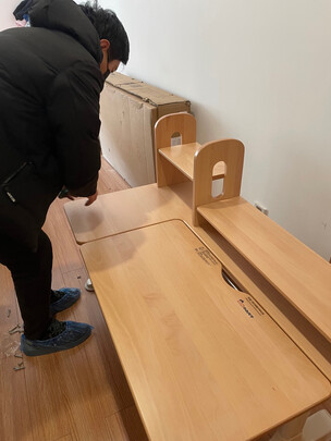 不错,做工扎实,桌面实木的,桌椅都可以调节高度,对得起价格,椅子坐着也很舒服,性价比高,值得推荐。小型号,正好两娃一人一个,省空间。
