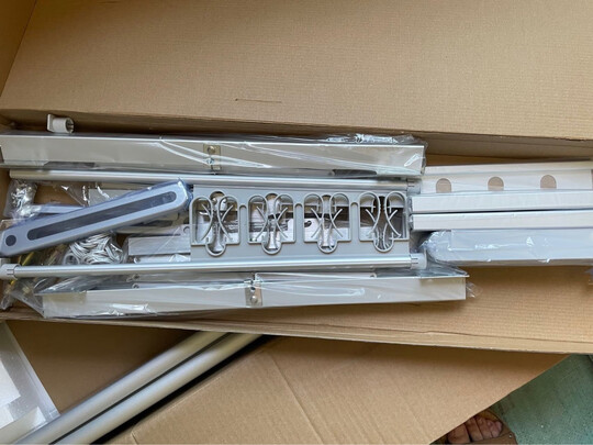 京东造的产品,设计很好,适合小阳台,两个横杆中间的空间也利用了起来。衣服多时,两边的拉杆可以拉伸,不需要时可以折叠收起。最喜欢的就是照明,很亮,而且免费拆旧的。