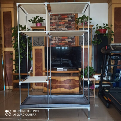 还是挺满意的,毕竟在外买个木衣柜的花销太大,个人衣服量还好,可以放得下,第二次买了,之前那个用了大概一年,在太阳底下晒的布已经不行了,倒过两次,塑料连接件寿命不长,剩余的都换完了,可以自己换两个铝合金试试,上图