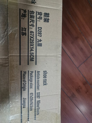 收到货,打开包装一看傻眼了,这是什么呀,都想退货了,再一想,先组装一下试试吧,在组装的过程中慢慢有信心了,商家给的配件刚好能组装6层,组装好后一看:鞋架好漂亮呀,质量也是很不错的,关键是它的宽度够大,这下全家常穿的鞋有去处了,很满意
