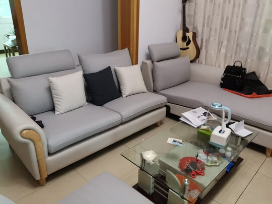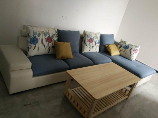 风格款式:款式简洁大气 看起来很上档次 颜色也很好看 实物比照片更好看 家里人都说很好看 送的两个小凳子也很可爱;适用户型:适用客厅比较大的户型 我们家是自建房 客厅比较大;舒适程度:沙发软硬适中 ;材质特点:布艺面料很舒服 ;售后服务:安装师傅下雨天给我们送来安装 服务很好呦
