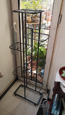 外形外观:还行,灰色挺好看的,高度不是很高。;占地大小:小巧,可以放7盆小花。;安装体验:很简单就装好了。;产品质量:挺结实的,放一些小花盆没问题。;风格特点:买回来是打算放绿萝的,结果每一层高度不够,绿萝放不下,,,只能放一些小花盆了。;其他特色:只能放直径10厘米左右的小花盆,再大就不好放了。