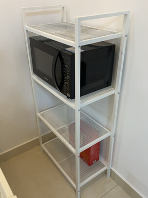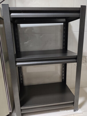 架子颜值不错,放客厅角落不会显得突兀。尺寸大小明显是设计过的,装下一个较大尺寸的微波炉刚刚好。靠墙放的话,稳固性不是问题。安装的话,可以先放倒拧上螺丝80%,再立起来拧紧,很简单。