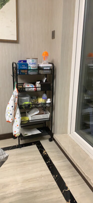 安装很简单,东西也不是很重,做工很好,带轮子,可以推动,小篮子都有小孔,可以漏水,配有挂钩,可以更多的利用空间。配米桶刚好放下。