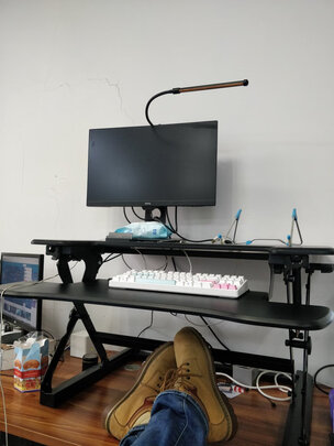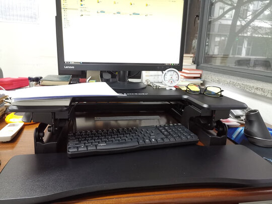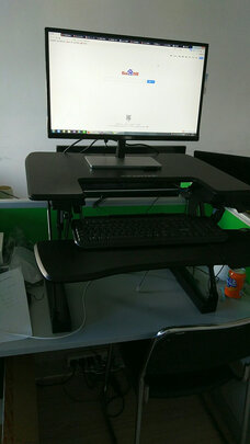 比想象中的还要大一圈,不过还好桌面刚刚够,用起来非常好,省力,坐久了站一下很舒服,而且不耽误工作,以前站起来显示器翻不上来,脖子一直吊着很难受,真的是神器。不过也有缺点,放显示器的台面有点滑,放东西不太放心,不知道用一阵会不会好一点,另外坐着的时候是用不了这个键盘托了,显得有点高了,手腕吊着会比较累,用鼠标也得放在旁边,总的来说,桌面小的不要考虑这款,大桌用着会很好。