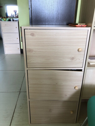 这个柜子的各个零件都中规中矩,严丝合缝,很好安装。大小高度也很合适,放在门口,装点买回来还没清洗的零食饮料水果什么的,真是特别方便和好用。板材的颜色也很素净,和一起买的另外一个牌子的书柜很搭。活动价格也很给力。