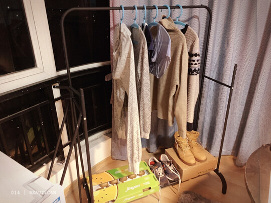 在这里要非常感谢客服 一根横杆的圆孔跟下面的竖杆连接不上 客服发了两次快递 非常有耐心想解决方案 给这样的服务点赞哈;外形外观:很简洁的风格 给漂泊在外的朋友们的小窝增加了温暖;产品材质:钢管吧 反正螺丝拧紧 挺坚固