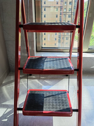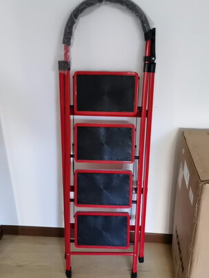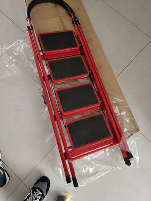 【工来工往】梯子家用人字梯折叠梯子楼梯多功能梯子登高梯室内梯子爬梯合梯家用扶梯踏步梯小梯子四步梯 高扶手四步钢梯;产品材质:梯子材质是钢的,非常不错;承重能力:两个人站上去稳稳的,200斤左右,绝对没问题;外形外观:形状简约,收纳方便,红配黑经典色;体积大小:收起来不占地方,非常好用