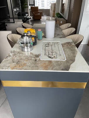餐桌岩板桌面看着很上档次 耐刮耐磨没有异味 整体稳固结实 做工精细
