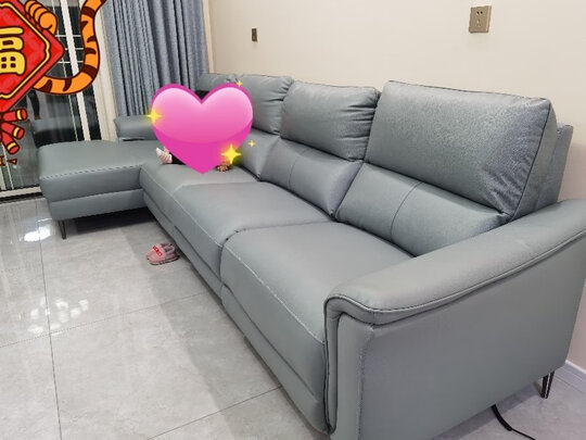 沙发挺好的,长短合适,颜色和我买的窗帘也很配。师傅安装服务周到。带一个功能位。比实体店看的性价比更高。颜色灰中带蓝。还是不错的。坐下去软硬适中。皮质有脏东西一擦就能擦干净。新房新沙发。大吉大利。