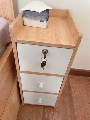 之前买过一个,觉得很合适,所以再买一个。这个款是基本不用螺丝的款,所以整体性很强。就是在外观上会有一些交错的印子,但是看习惯了也就好了。抽屉也没有导轨的,用的就是木轨,拉起来倒也还可以。完全没有味道。只是样子稍微有点小。