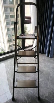家里原来用的梯子经过几次装修之后已经破损不堪,于是决定更换一个。柜子里面原来设计用来储存梯子的空间高度只有145.5cm,原来用的梯子是三层,比较矮,有些高的地方够不到,所以这次决定买一个4层梯子,但高度要满足储存空间,所以找来找去,最终找到了这个梯子,高度刚刚好。收到之后感觉很有分量,表面的电泳颜色也很漂亮,梯子展开之后也没有任何的吱呀作响的声音,非常扎实,爬上去之后让人很放心,原来够不到的地方也轻易就够到了。五星好评。