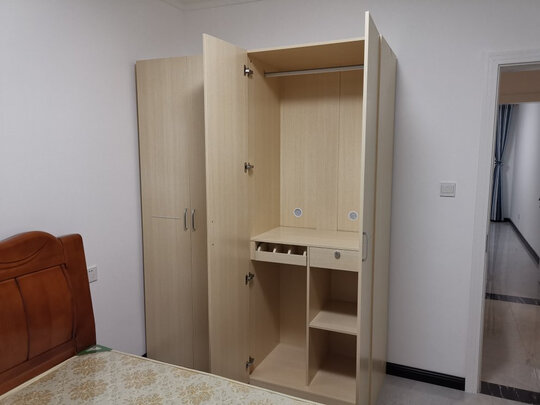材质很好,虽然不是实木,但基本没有味道,内部容量很大,买了两个对面装上,很上档次,滑轨质量也好。挂架和裤架设计都很贴心