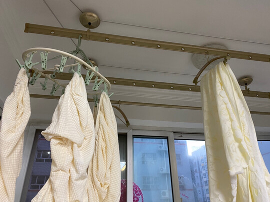 好太太这款新的四杆晾衣架,颜色特别高大上,功能也非常好,钢丝很顺滑,也不会打结。可以晾晒很多衣服和被子,小哥安装质量也非常好,赞一个。
