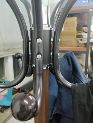 衣架整体美观,木制花纹,简约大气又显庄重。组装过程比较简单,组装后结构稳定,转动时轴承平滑。两层挂钩设计,可容纳更多衣物。总结:实用,美观。