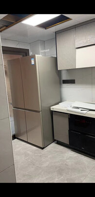 冰箱非常干净整洁美观大方,开放式厨房的设计选择松下电器秒杀一切品牌,白色玻璃门配上白色的橱柜太高大尚了!