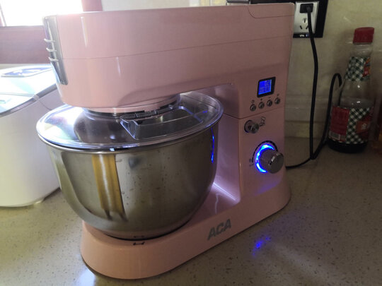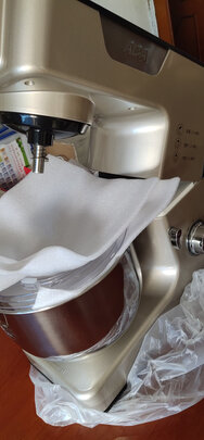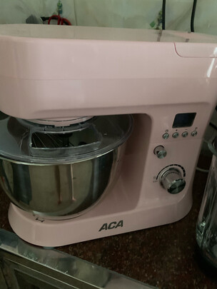 本来是买另一款5.5L的型号,有点问题退回去了!售后服务非常好!看到这款容量大一点加上是粉色果断入了!厨师机外壳是塑料的,毕竟价格在这儿也不能要求太高!今天第一次用来和面,一开始用2档,出粗膜后加黄油用4档,出手套膜前前后后也得有30几分钟了,工作时的声音还可以接受!有了这个做面包方便多啦!接下去打算做戚风蛋糕胚卖,希望也是这么好用!