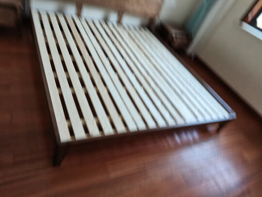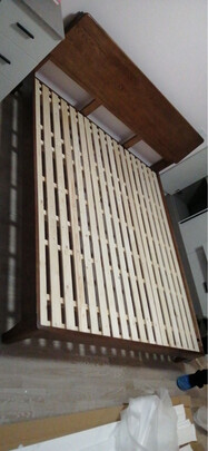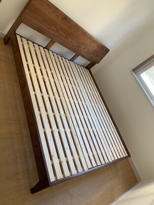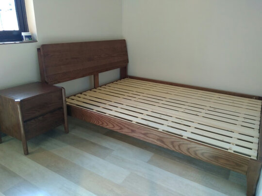 床很漂亮,框架是白蜡木的,床头板整板木纹理自然。铺板是松木的,实木多少会有一点瑕疵,有木结、小坑小洞等,自然的才好。