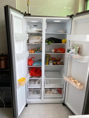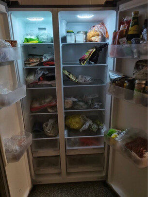 容量大小:这个冰箱600升的容量,想放多少东西都没问题啊!不过像这种双开门的,这款冰箱虽然有除味的活性炭,但还是要注意用保鲜膜把一些有味道的东西给他封好放进去。