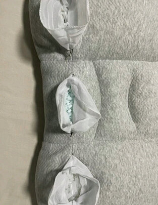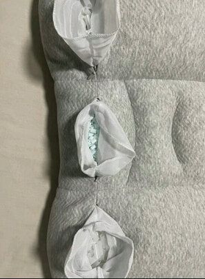 四个分区可调高矮,透气性好,适合睡觉爱出汗的人用,很舒服,非常的柔软,而且不会有什么声音,也没有什么气味,中间有一小坨如图是蓝色的小管子,睡起来的感觉不是那么的软,对脖子起到了很好的支撑,比之前买的乳胶枕头确实舒服一些
