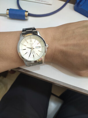 手表有点厚实。上手感觉不错。男人戴着大气。晚上夜光看起来很漂亮。是一圈夜光那种。不是只有时针和分针那种。很漂亮。