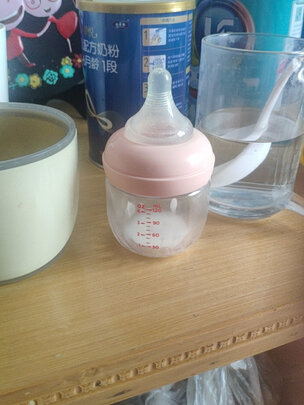 物流很快,奶瓶收到了,玻璃的无异味,宝宝用着还挺好的,已经用了3个了,都被宝宝给摔碎了,建议做个皮套可以防摔的就好了。
