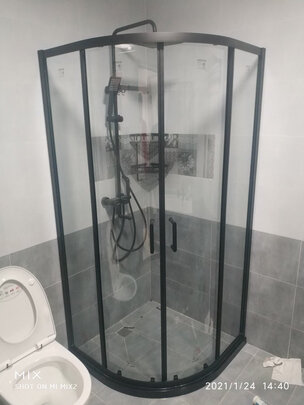 买的90*100,空间稍大一些。铝合金选了黑色的,这样不容易有水渍,看起来也有质感。钢化玻璃厚度6㎜,一般来讲家用够用了,玻璃上贴了防爆膜,安全性较好。