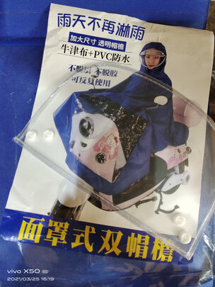 打开上身试了一下 大小非常合适 适合我的电动小车车 颜色也很漂亮 质量很好 但是又不会很厚很沉 还是非常方便穿脱喝携带的 前面一块透明的 不影响车灯 最近正是雨水多的季节 特别是雷阵雨 说下就下 备着点雨具 避免被浇成落汤鸡