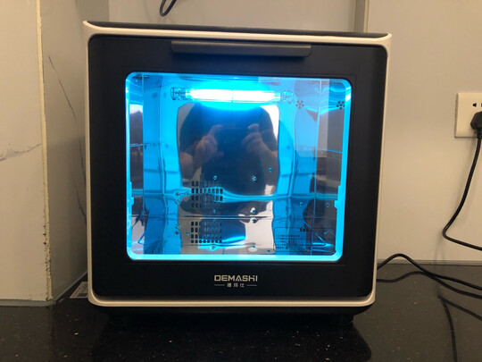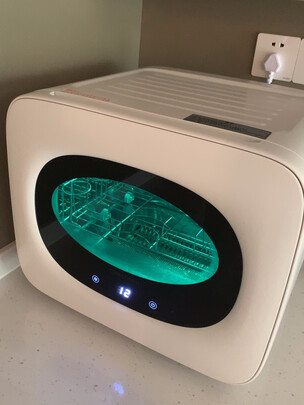 颜值很高了,噪音也不大,工作的时候发出蓝光我儿子说像科幻电影,但是热风循环不能完全把水份带走,还是不能偷懒要晾干了再消毒。还有保护不锈钢面板的那个膜可真难撕啊,撕得心碎。
