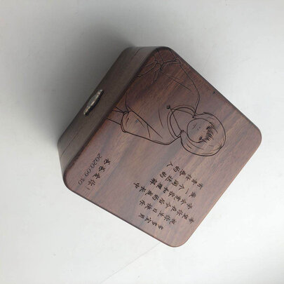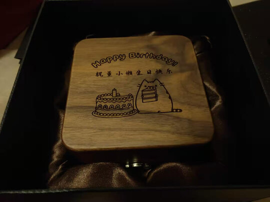 刻字神速!上午给的图样,当天就发货了,而且还是在春节前夕。好惊喜!八音盒的木纹很有质感,很好看。RHYMES的机芯,音很准。还送了两张精美的贺卡,好周到。~客服也好棒,回复神速,沟通顺畅。很愉快的一次购物体验。