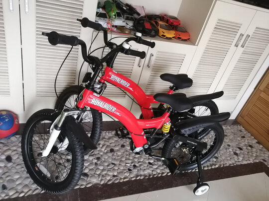 宝宝一直念着的单车终于到手了,昨天下午下单,今天中午就送货到家了,给快递小哥点赞?,这么热的天,直接送到家。到家就迫不及待地打开包装了,完全同商品描述,不愧是大品牌,品质给力,这个价钱也值了,每个细节都很到位,95%已组装,自己只要装车把,坐垫,辅助轮,铃铛及车轮防水盖,再充上气就大功告成了。美中不足是18寸没有挡泥板,宝宝好想要配挡泥板,只能以后自己另外买了。对了,还送了护具与头盔,打气筒。总之,很满意啦!宝宝说拥有这辆单车是很幸福的一件事?希望这辆单车能陪伴宝宝快乐健康成长!给大家参考下125身高正适合18寸,预计还可以骑2~3年。等骑过一段时间再来评价哈?