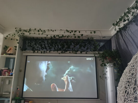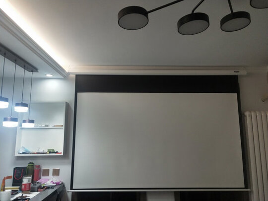 这个幕布按上后,看视频的效果好太多了,而且安装方便,自己打两个孔就能按上了,电动方便,不用就拉上去。就是投影仪要和幕布位置要对好,之前投影在墙上,不挑位置视频不卡,现在需要对准幕布,投影仪有已经固定了,所以看起来会不流畅