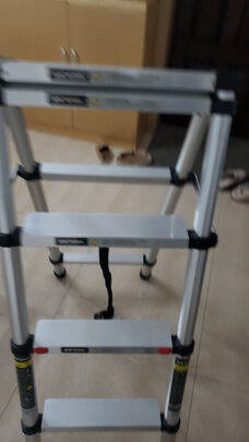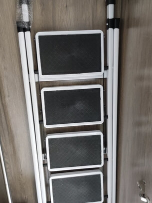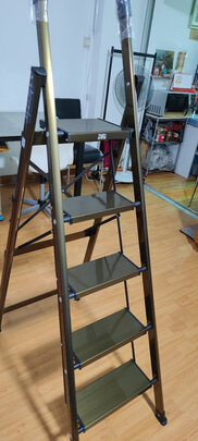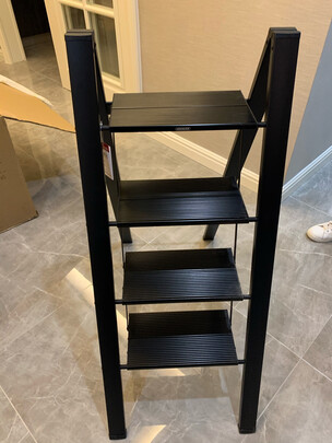 很满意的一次购物,黑色的梯子非常有时尚感,和家里装饰也搭配,用了加厚的料子,人站上去很稳当,还设置了放工具的架子,考虑的很周到。买的四层的梯子,站上去正好够到往吊柜里放东西。