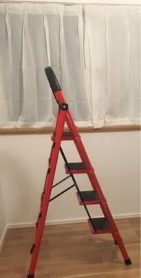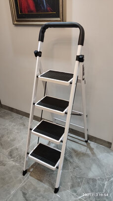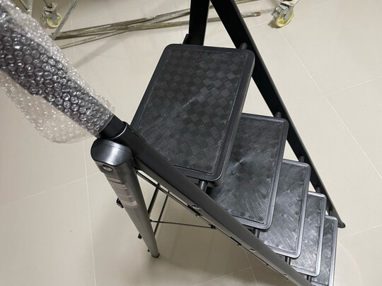 梯子质量挺好,非常稳当,踩上去没有一点晃动。我一米七五,踩最高一台,很轻松探到2米7的房顶。支架脚垫有橡胶包裹,不伤地面。刚装修完家,很多需要踩高台上去打理的。