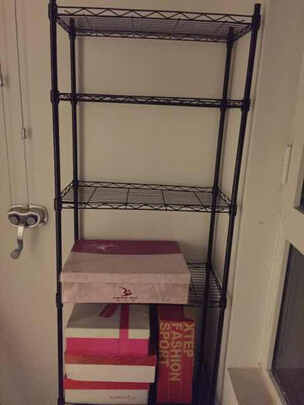 买来在阳台放鞋盒,挺好用的。也很结实。女生一人20分钟就装好了。;