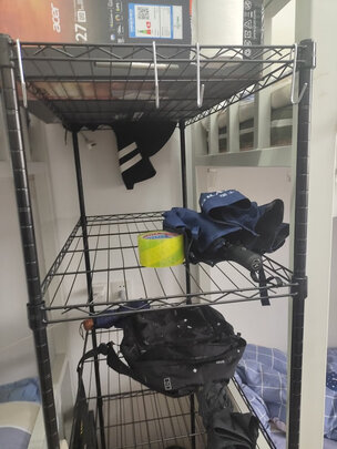 架子非常好,可以放很多东西。因为换宿舍了,八个人只有一张桌子,储物空间大大缩小,所以买了个架子放在两张床的中间。架子的高度还可以随意调节,这就很棒!