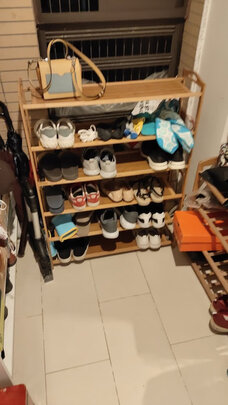 外观样式:简洁,木纹颜色比较百搭;商品质量:符合价位,很好安装,安装好了也足够结实,有一块板子安装的时候有一点开裂,商家马上免费寄了一块过来;适合场景:家里原有的鞋架太小了放不下,所以买了这个大的,很实用;承重能力:足够正常使用,每层3-4双鞋,加一些小物件,结实稳固,不摇晃;产品材质:板子有点薄,但是够用了,这个价位就不要求自行车了;图二是商家寄来的板子